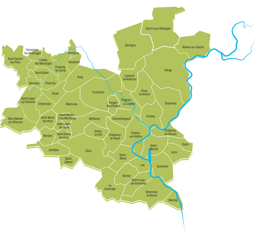 Allerey-sur-Saône, Aluze, Barizey, Bouzeron, Chagny, Chalon-sur-Saône, Chamilly, Champforgeuil, Charrecey, Chassey-le-Camp, Châtenoy-en-Bresse, Châtenoy-le-Royal, Chaudenay, Cheilly-lès-Maranges, Crissey, Demigny, Dennevy, Dracy-le-Fort, Épervans, Farges-lès-Chalon, Fontaines, Fragnes-La-Loyère, Gergy, Givry, Jambles, La Charmée, Lans, Lessard-le-National, Lux, Marnay, Mellecey, Mercurey, Oslon, Remigny, Rully, Saint-Bérain-sur-Dheune, Saint-Denis-de-Vaux, Saint-Désert, Saint-Gilles, Saint-Jean-de-Vaux, Saint-Léger-sur-Dheune, Saint-Loup-de-Varennes, Saint-Loup-Géanges, Saint-Marcel, Saint-Mard-de-Vaux, Saint-Martin-sous-Montaigu, Saint-Rémy, Saint-Sernin-du-Plain, Sampigny-lès-Maranges, Sassenay, Sevrey, Varennes-le-Grand, Virey-le-Grand
